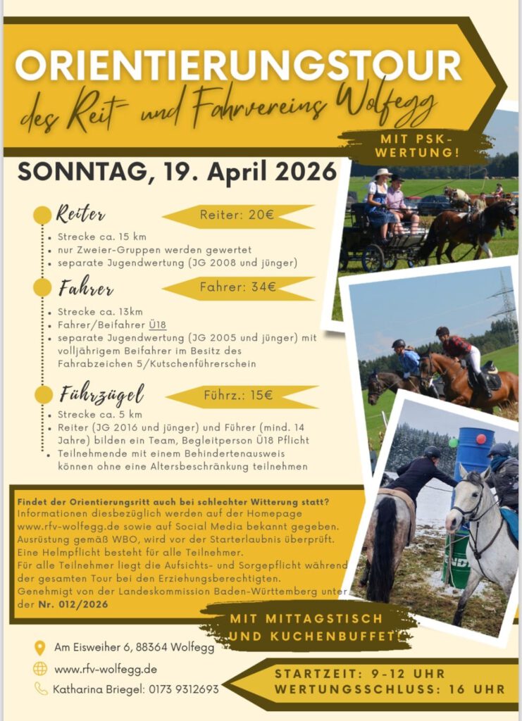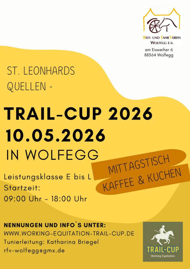 Egal ob du bereits Erfahrung in der Working Equitation hast oder diese Disziplin gerade erst für dich entdeckst, der Reit- und Fahrverein Wolfegg e.V. lädt dich herzlich ein, dabei zu sein. Melde dich noch heute an und erlebe einen unvergesslichen Tag voller Spaß, Teamgeist und Pferdeleidenschaft beim Working Equitation Trail!